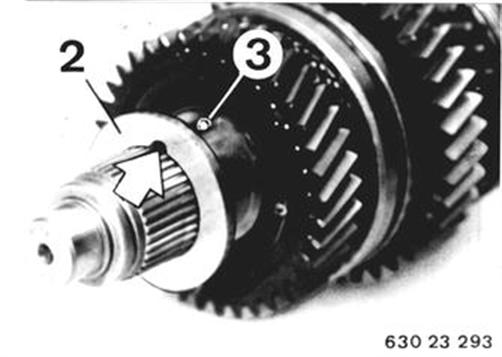 Install needle bearing, 3rd gear wheel and synchromesh ring. Install guide and operating sleeves on splines with the long collar facing the 3rd gear wheel. Version with Three Grooves: The grooves must face the 4th gear wheel. | ![]() |
