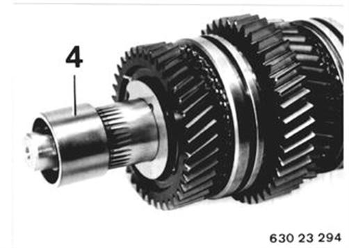 Press 2nd gear, bearing sleeve, 3rd gear, synchromesh ring and guide sleeve off of output shaft with Special Tool 23 2 080. Pressing-off force*. * See Specifications