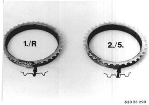 Transmission 260/6: Identification of Synchromesh Rings: To avoid mixing up synchromesh rings for 1st/ 2nd and 5th/reverse gears, they must be checked for codes and tooth width. Synchromesh ring for 1st/reverse gears has drawing no. 011.8.0241.00 and narrow teeth. Synchromesh ring for 2nd/5th gears has drawing no. 011.8.0161.00 and wide teeth. | ![]() |