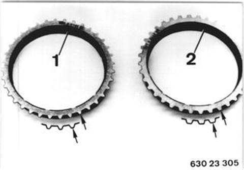 Identification of Synchromesh Rings: To avoid mixing up synchromesh rings among each other, it is important to note the drawing number and tooth width. Synchromesh ring (1) for 1st/reverse gears has drawing no. 001.8.0241.00 and narrow teeth. Synchromesh ring (2) for 2nd, 3rd, 4th and 5th gears has drawing no. 011.8.0161.00 and wide teeth. | ![]() |