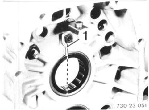Installation: Heat ball bearing inner race to approx. 80°C (175°F) with a hot air blower and slide on to output shaft. Important! Opening in bearing inner race must engage in ball. Draw line (1) to make installation of bearing race easier. | ![]() |