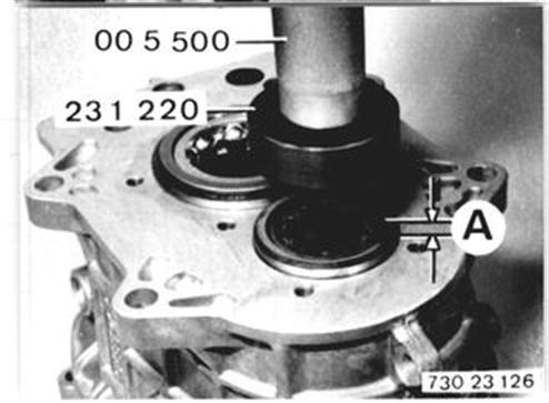 Drive layshaft roller bearing out and in with Special Tools 23 1 220 and 00 5 500. Protrusion A = approx. 5 mm (0.197´´). Install roller bearing that open end faces in. | ![]() |