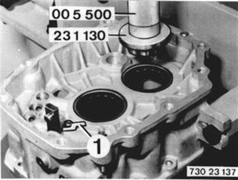 C) Output Shaft, Layshaft in Intermediate Case: Remove input and output shaft assembly 23 21 503. Drive roller bearings for input shaft and layshaft out of intermediate case with Special Tools 23 1 130 and 00 5 500. Important! Unscrew and turn oil plate (1) in case of roller bearing for output shaft. 23 21 503