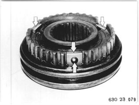 Vehicles after change point in 1982 DISASSEMBLING/ASSEMBLING COMPLETE SYNCHROMIZATION - Output Shaft Removed - Disassemble output shaft (see 23 21 554). All synchromesh rings are identical and coated with molybdenum on the inside. Check distance* between synchromesh ring and clutch. Measure in area of stops. Synchromesh rings should bear uniformly all around. 23 21 554 * See Specifications