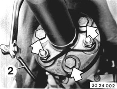 Unscrew center mount. Installation: Preload center mount forward by distance A = 2 to 4 mm (0.079 to 0.157´´). Tightening torque*. Bend propeller shaft down and pull off of centering pin. Important! Suspend propeller shaft from car on piece of wire. * See Specifications