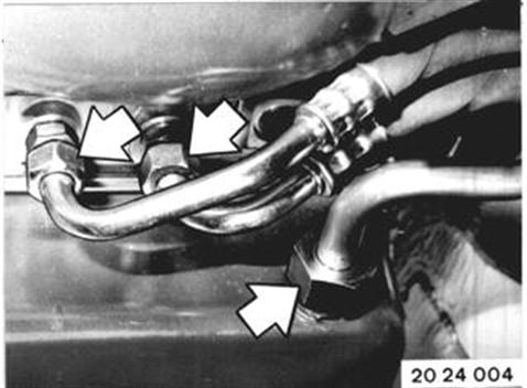 Drain oil. Important! Never reuse drained oil. Installation: Transmission will have to be disassembled, if oil smells burnt and is black. Important! If transmission was defective, clean oil cooler and lines with compressed air and flush twice with ATF. Remove oil filler tube. Disconnect oil cooler lines on transmission. Tightening torque*. * See Specifications