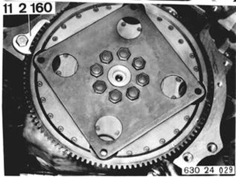 Installation: Check drive plate for breaks and cracks, replacing if necessary. Hold flywheel with Special Tool 11 2 160 when replacing. Unscrew stretch bolts. Important: Replace stretch bolts and install new ones with Loctite No. 270. Clean tapped bores thoroughly. Only paste thread. Torque valne¹). ¹) See Specifications