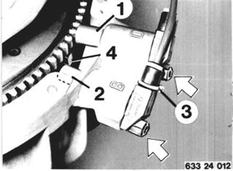 Unscrew heat shield. Unscrew screws. Pull out speed sensor (1) and reference mark sensor (2). Important! Check installed position. Do not mix up plugs. Install speed sensor (1), black plug facing gear ring, and reference mark sensor (2), plug with gray ring (3) facing pin (4). Engine cannot be started, if plugs are mixed up. | ![]() |