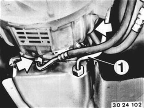Drain oil. Important! Never reuse drained oil. Installation: The transmission will have to be disassembled, if oil has a burnt odor and is black. Important! If transmission was defective, clean oil cooler and lines with compressed air and flush twice with ATF. Remove oil filler neck (1). Unscrew oil cooler lines on transmission and plug open connections with caps. Installation: Tightening torque*. * See Specifications