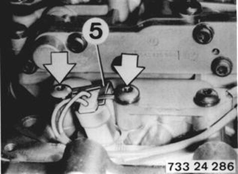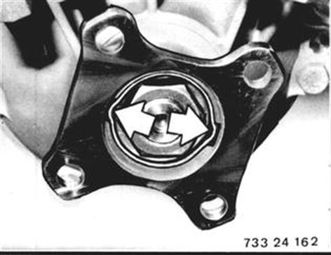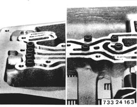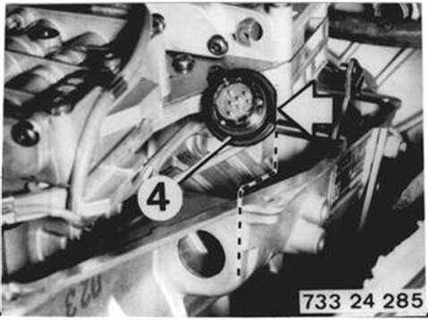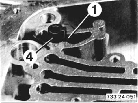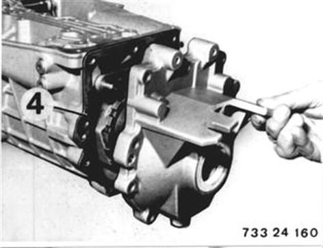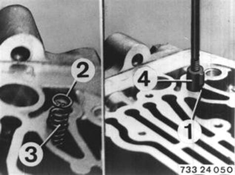 Important! The lubricating oil feed to the cylinder F gear set was improved and introduced gradually since 7.85. Circlip (2), spring (3) and sealing sleeve (4) must also be removed at bore (1). Pull sealing sleeve (4) out of the bore with a M 6 x 65 screw. Don´t cant the screw. | ![]() |