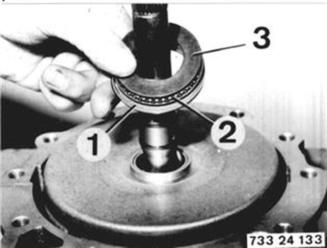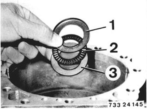 Set transmission upright. Insert thrust washer (3), axial bearing (2) and angled washer (1) with collar facing up. | ![]() |