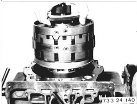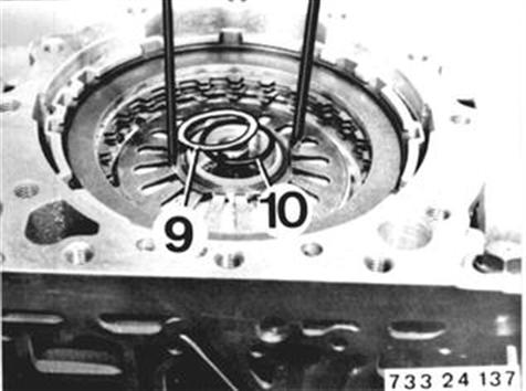 B) Assembling: Install 4th gear clutch set. Guide clutch set into transmission case that 4 oil feed bores are aligned with bores in case. | ![]() |