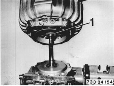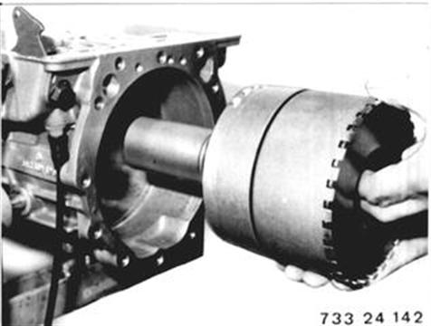 Vehicles after change point in 1982 DISASSEMBLING/ASSEMBLING TRANSMISSION Remove transmission 24 00 022. Remove torque converter 24 40 001. Mount transmission on Special Tool 24 0 150 in conjunction with an assembly stand. Important! Screw in bolts only finger tight to prevent damaging transmission case. 24 00 022 24 40 001