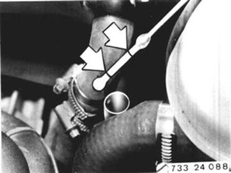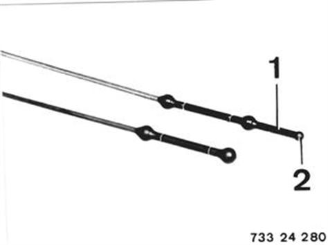 An oil dipstick with a longer measuring tip (1) is standard since 2.85. This produces an earlier dsplay of the oil lever in the transmission. The oil level must not be below ball (2) after a test drive and an oil temperature of approx. 40°C (105°F). The oil level must be between min. and max. marks with an oil temperature of approx. 80°C (175°F). Correct oil level, if necessary. Note: The new oil dipstick can be installed retroactively. Oil Level Too High: Strong foaming, splash loss, high temperature when driving fast, oil lost via vent. Oil Level Too Low: Valves rattlind, foaming, engine slipping, general operating disturbances. | ![]() |