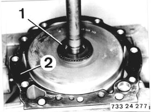 Lift off converter bell housing. Installation: Thrust washer (1), needle cage and angled washer. Note: The axial play of the input shaft can be adjusted with thrust washer (1). Replace gasket (2). | ![]() |