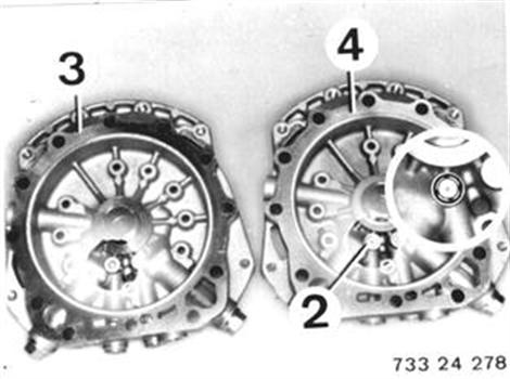 A transfer plate with venting valve (2) is installed since Transm. No. 170 195. The venting valve provides faster pressure drop for clutch A. Only use transfer plates with a venting valve for repairs. Transfer plate (3) without venting valve. Transfer plate (4) with venting valve. | ![]() |