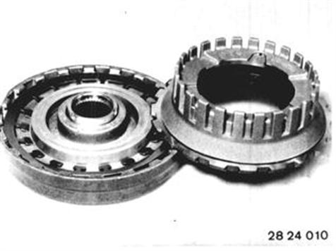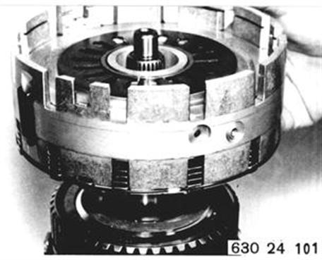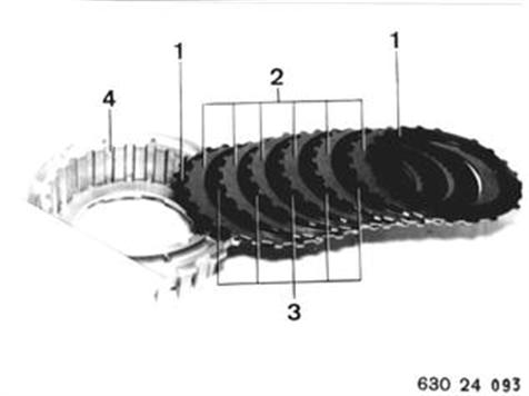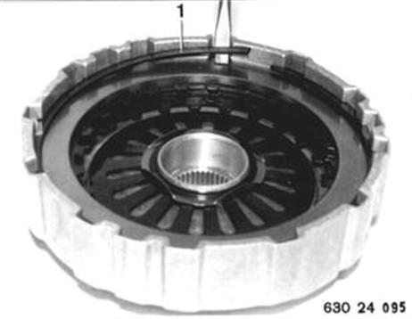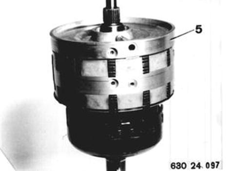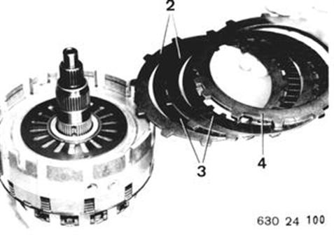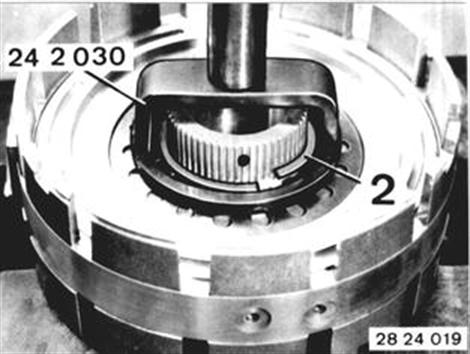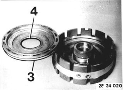 Vehicles before change point in 1982 REPLACING PLATE CLUTCHES AND BRAKES Disassemble transmission 24 00 080. Clutch A: Press clutch assembly together and remove snap ring (1). Remove plate carrier (2). 24 00 080