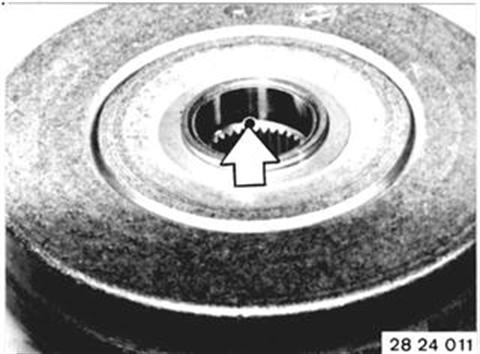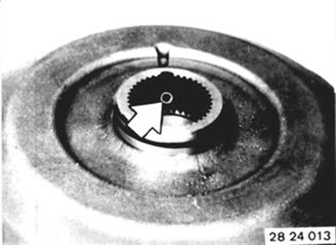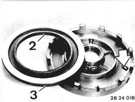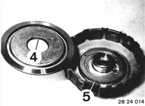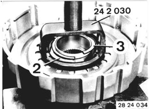 Bend open lock plate (2). Push down spring diaphragm with Special Tool 24 2 030 and remove circlip (3). Installation: Replace and lock lockplate. Install diaphragm spring with curved surface facing up. | ![]() |
