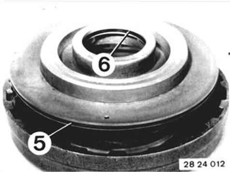 Vehicles after change point in 1982 REPLACING PLATE CLUTCHES AND BRAKES Disassemble transmission 24 00 080. Clutch A: Press out input shaft (1). Check O-ring (2), replacing if necessary. 24 00 080