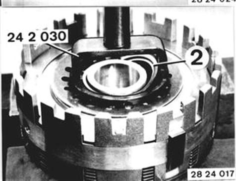Push down on diaphragm spring with Special Tool 24 2 030 and remove split retaining ring (2). Installation: Install diaphragm spring with curved surface facing up. | ![]() |