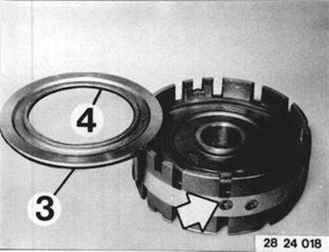 Compress clutch assembly and lift off circlip (3). Remove plate carrier (4). | ![]() |