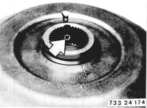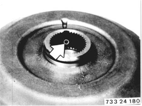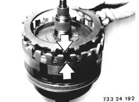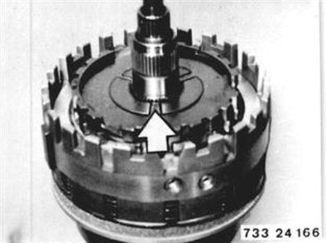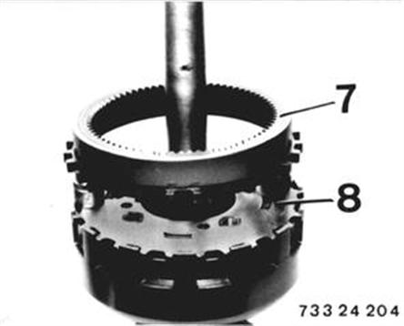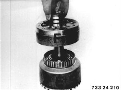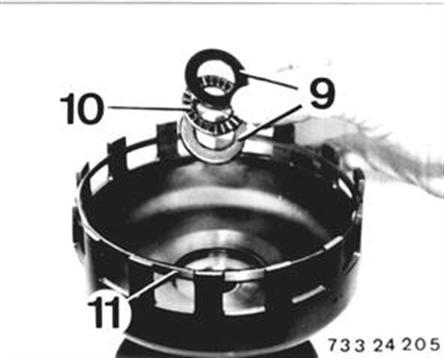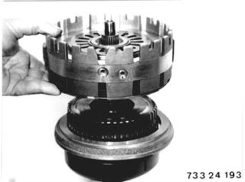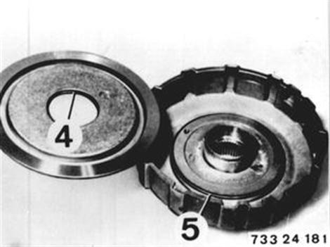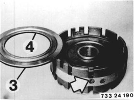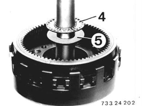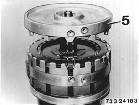 Clutch C´and C: To make this step easier, place complete set in a pipe with an inside diameter of 29 mm (1.142´´) and clamp in a vise. Remove Special Tool 24 0 040. Lift off centering plate (5). Installation: Bevelled beads must engage in bevelled openings. | ![]() |