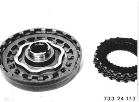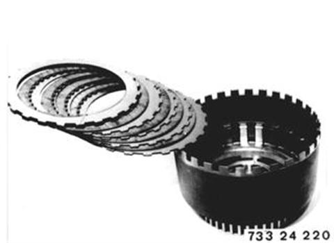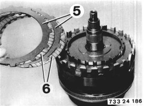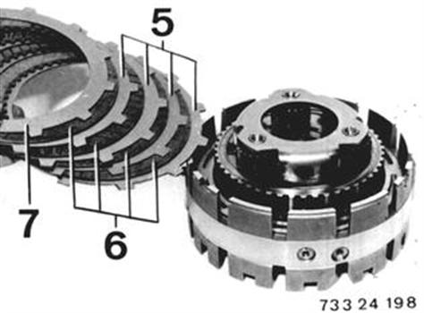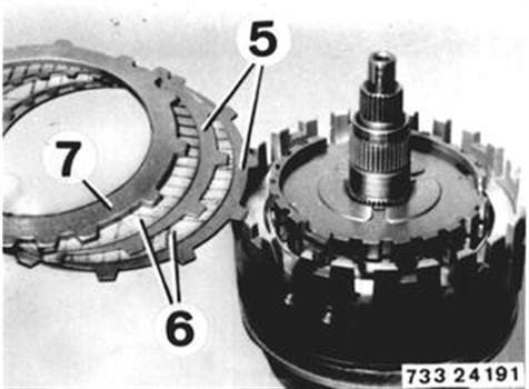 C Installed Order: Insert noted number of removed steel and lined plates alternately, beginning with a steel plate. 5 Steel plates 1.8 mm Important! Steel plates for BMW 635 CSi have different thicknesses (1.5 and 2.1 mm). The thinner (1.5 mm) steel plate is installed on the piston end. 6 Lined plates. 7 End plate 4.5 mm | ![]() |