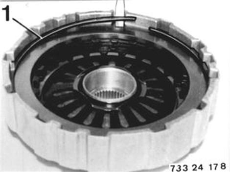 Remove piston for clutch F. Press down on diaphragm spring with Special Tool 24 2 020, and lift out split retaining ring (1). Installation: Insert diaphragm spring with curved surface facing up. | ![]() |