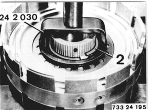 Remove piston for clutch E. Press down on diaphragm spring with Special Tool 24 2 020 and remove the split retaining ring (2). Installation: Insert diaphragm spring with curved surface facing up. | ![]() |