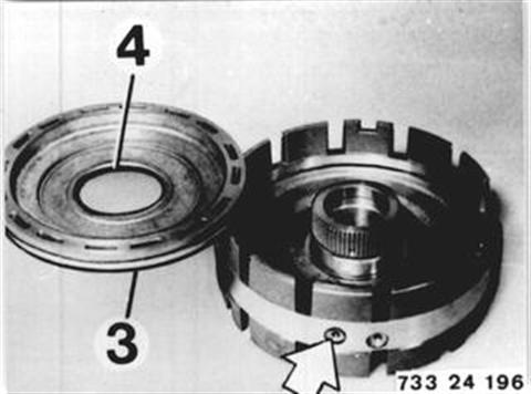 Compress clutch set and remove snap ring (3). Remove plate carrier (4). | ![]() |