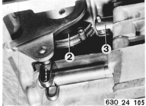 Installation: Position valve body that clamp on selector valve can be attached in operating arm of pawl. Pull transmission cable slightly for this purpose so that accelerator cam (2) does not clamp on throttle pressure valve (3). | ![]() |