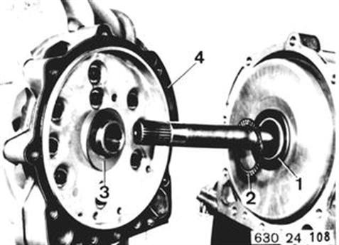Installation: Mount angled disc (1) on input shaft with collar facing needle bearing (2). Hold thrust washer (3) on converter bell housing with grease. Replace gasket (4). | ![]() |