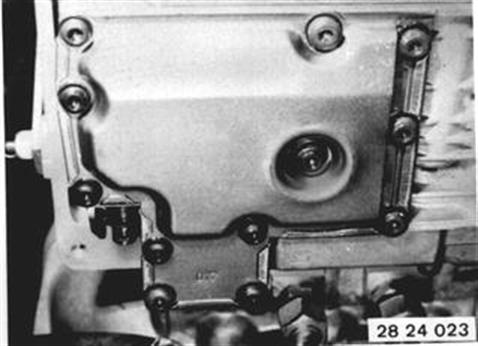 Vehicles before change point in 1982 DETACHING AND ATTACHING OIL FILTER SCREEN ON VALVE BODY Remove oil pan 24 11 000. Remove oil filter screen. Installation: Clean or replace oil filter screen, if it starts to gum up with a brown residue. Tightening torque¹). Important: Modified oil filter screen - larger mesh size. Renew oil filter screen every 30 000 miles. 24 11 000 ¹) See Specifications