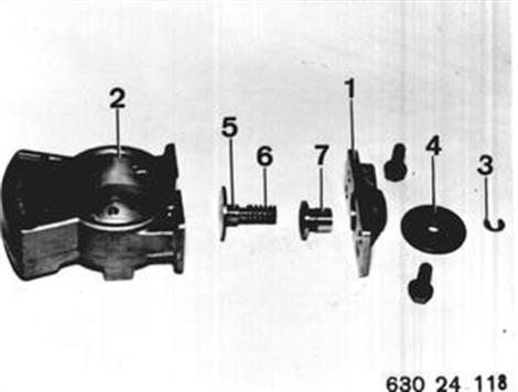 Vehicles before change point in 1982 DISASSEMBLING/ASSEMBLING CENTRIFUGAL GOVERNOR - Centrifugal Governor Removed - Detach cover (1) at housing (2). Lift off circlip (3) and remove washer (4). Remove governor piston (5), spring (6) and governor bushing (7). Installation: Governor piston must slide into governor bushing without restriction. Replace circlip (3).