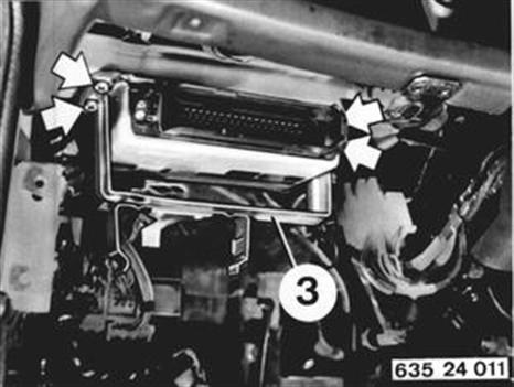 Vehicles after change point in 1982 REMOVING AND INSTALLING OR REPLACING EH CONTROL UNIT The AEGS control unit is located underneath the instrument panel on the left side. Remove instrument panel trim at bottom left - see 51 45 180. Push back spring retainer (2) and pull off plug (1) on control unit. Caution! Always turn off ignition before disconnecting or connecting plug (1). 51 45 180