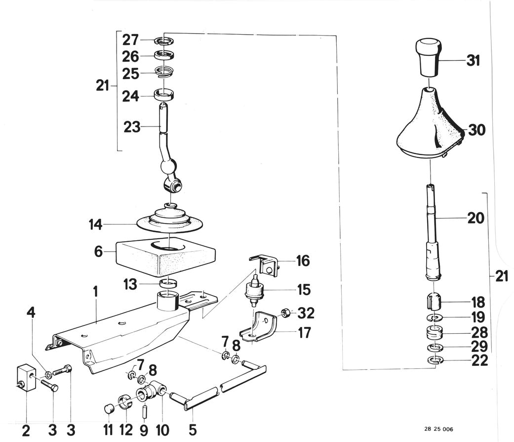 Vehicles after change point in 1982 - Shift Console Made of Sheet Steel - 1 Shift arm 2 Console 3 Bolt 4 Washer 5 Shift rod 6 Damper plate 7 Retainer 8 Washer 9 Pin 10 Shift rod joint 11 Lubricating felt 12 Spring sleeve 13 Spherical shell, lower 14 Rubber cover 15 Rubber mount 16 Holder 17 Holder 18 Cap 19 Lockwasher 20 Shift lever upper section 21 Shift lever assembly 22 Circlip 23 Shift lever lower section 24 Spherical shell, upper 25 Spring 26 Spacer 27 Circlip 28 Rubber ring 29 Washer 30 Dust cover 31 Shift lever knob 32 Nut