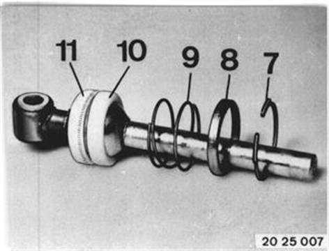 Remove circlip (7), spring retainer (8), spring (9), upper shell (10) and lower (ribbed) shell (11). Installation: Lubricate upper and lower spherical shells with Molykote Longterm2. | ![]() |