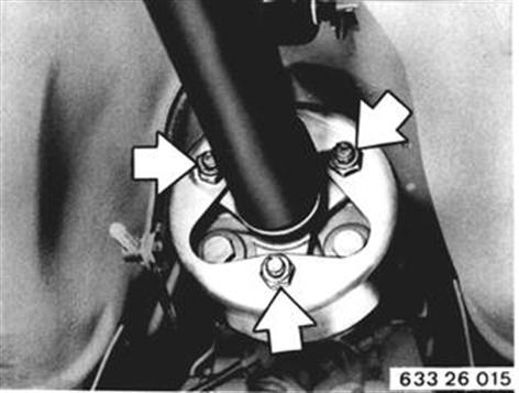 To prevent stress in Giubo coupling and therefore vibration and drumming, use Special Tool 26 1 011 for removal and installation of propeller shaft. Unscrew bolts. Installation: Use stop nuts only once. | ![]() |