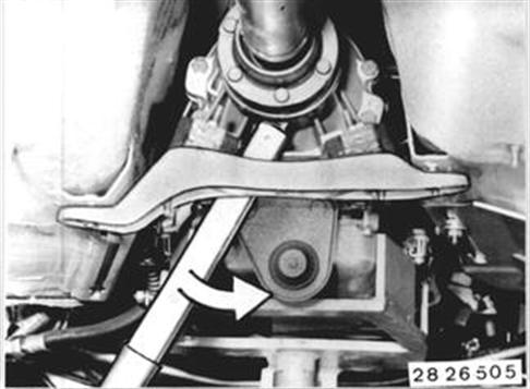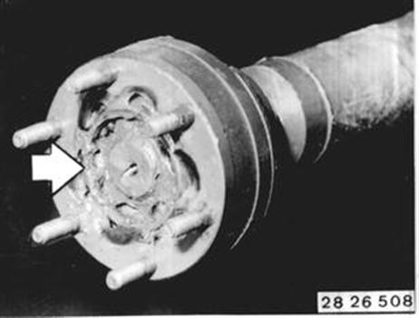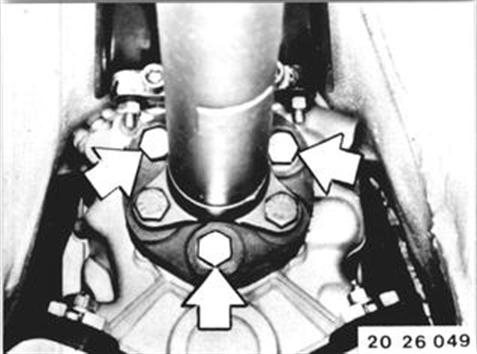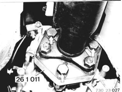 To prevent stress in Giubo coupling and therefore vibration and drumming, use Special Tool 26 1 011 for removal and installation of propeller shaft. Unscrew bolts. Installation: Use stop nuts only once. | ![]() |