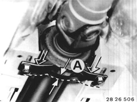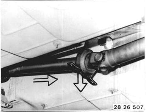 Detach center bearing. Installation: Preload center bearing forward in direction (A) by about 2 mm (0.080´´). | ![]() |
