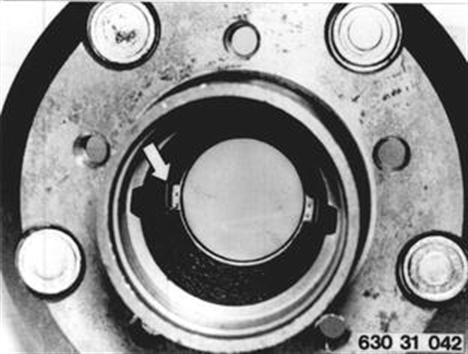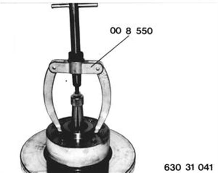 Vehicles before change point in 1982 REPLACING TAPER ROLLER BEARING AND SHAFT SEAL - Wheel Hub Removed - Remove shaft seal. Remove taper roller bearing. Pull out bearing outer races with Special Tool 00 8 550 OR | ![]() |