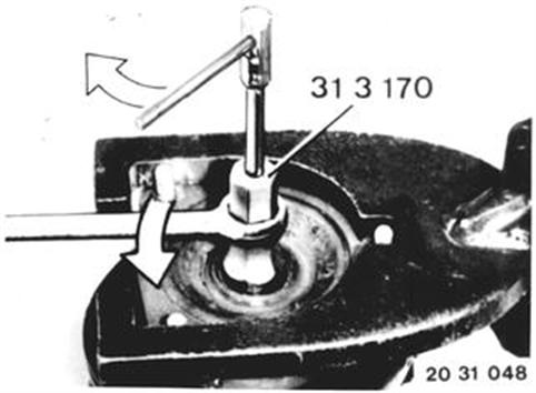 Pull off end cap. Unscrew self-locking nut with Special Tool 31 3 170, counterholding on the piston rod. Installation: Replace self-locking nut. Tightening torque*. * See Specifications of Gr. 31