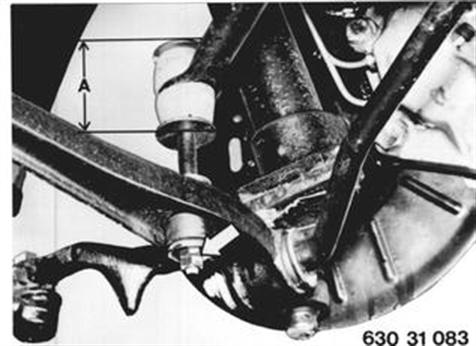 Unscrew bolts and press stabilizer off of control arm. Installation: Tightening torque¹) for control arm and distance (A) on pad for stabilizer must be maintained. Distance A = 60 mm (2.362´´) only for singlepiece rubber pad (also refer to 31 35 000). ¹) See Specifications 31 35 000