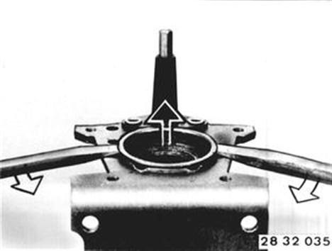 Installation: Push steering spindle into outer tube. Knock in bearing with Special Tool 00 5 550. Install ring (3) and collar ring (2). Mount snap ring (1) with Special Tools 32 2 052 and 32 3 050. | ![]() |