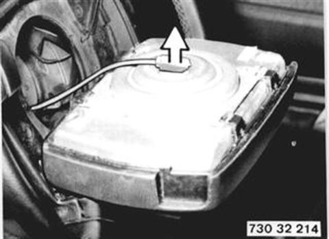 Pull off plug and remove SRS unit. Caution! Only lay the SRS unit aside (in trunk) with the impact pad facing up. Installation: Be careful not to pinch the wires. | ![]() |
