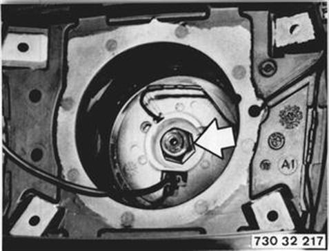 Move steering wheel to straight ahead position (marks on steering gear and steering spindle aligned). Unscrew nut and remove with washer. Important! The steering wheel can only be pulled off after unlocking the steering lock. | ![]() |