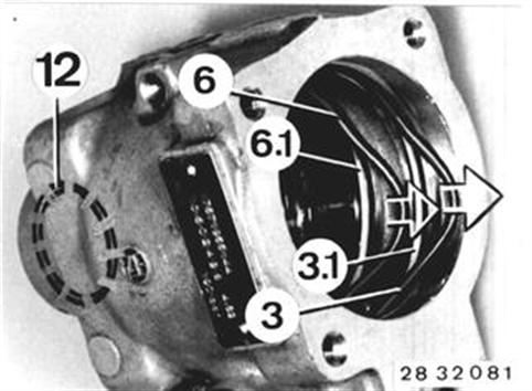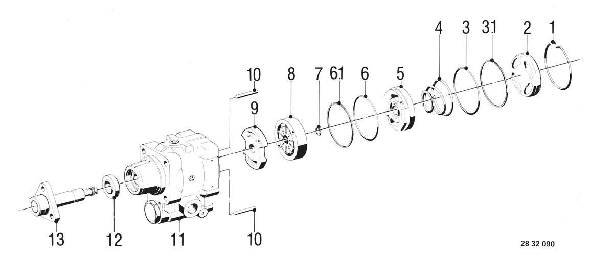 POWER STEERING PUMP ASSEMBLY DRAWING - Code No. 76 71 955 1 Hook-type snap ring 2 Cover 3 O-ring 3.1 Support ring 4 Spring 5 Face plate 6 O-ring 6.1 Support ring 7 Snap ring 8 Rotor set 9 Face plate 10 Dowel pin 11 Housing 12 Radial oil seal 13 Input shaft