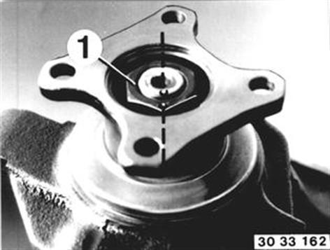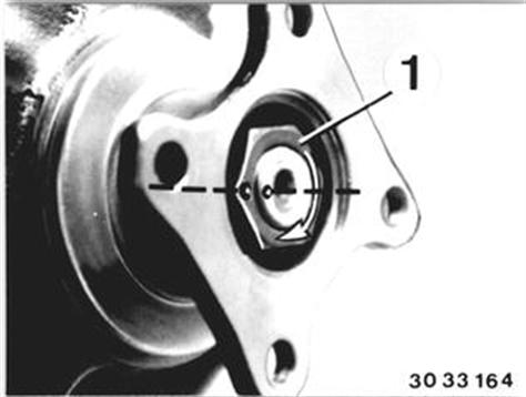 Tighten the input flange with collar nut (1) and then turn the nut further until the punch marks are aligned precisely. Important! Never tighten the collar nut past the punched marks and then back again, since then the bushing would have to be replaced - see 33 12 551. Installation: Replace the lockplate. Pour in final drive gear lube**. 33 12 551 ** See Service Information of Gr. 00