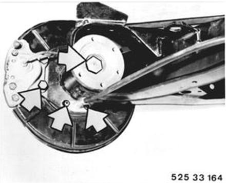 Vehicles before change point in 1982 MEASURING TRAILING ARM - Trailing Arm Removed - Remove brake disc 34 21 300. Remove rear axle shaft, see 33 41 100. Remove wheel bearings, see 33 41 601. Pull out both silent blocks, see 33 32 561. Unscrew nuts on parking brake cable support. 34 21 300 33 41 100 33 41 601 33 32 561