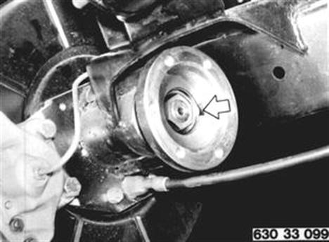 Apply Special Tool 33 1 100. Unscrew collar nut. Pull off drive flange. Installation: Tightening torque¹). Lock collar nut with new lockplate in groove of drive flange. ¹) See Specifications